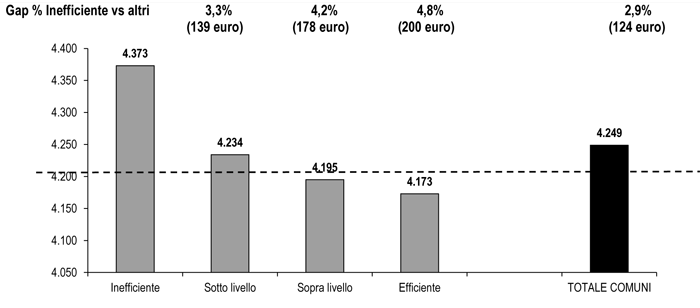Il prelievo immobiliare rappresenta un importante voce delle entrate dei Comuni. Un nostro recente studio ha proposto un confronto tra fabbisogni standard e spesa storica nei comuni delle regioni a statuto ordinario; in particolare viene evidenziato che il 30,7% della spesa è gestita in comuni inefficienti che offrono meno servizi registrando, però, una spesa storica superiore del 18,7% rispetto al fabbisogno standard. L’inefficienza della spesa dei comuni si trasla in una più elevata tassazione: il prelievo per una micro impresa tipo localizzata nei comuni inefficienti – e quindi beneficiaria di un livello più basso dei servizi – è del 4,8% superiore a quello di una analoga impresa che opera nei comuni efficienti.