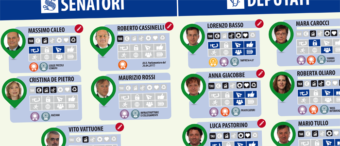 Promossi dodici parlamentari: i senatori Massimo Caleo (Pd), Roberto Cassinelli (FI-Pdl), Cristina De Pietro (FI-Pdl), Maurizio Rossi (Misto-Liguria Civica) e Vito Vattuone (Pd) e i deputati Lorenzo Basso (Pd), Mara Carocci (Pd), Anna Giacobbe (Pd), Roberta Oliaro (Misto-Civici e innovatori-Energie per l’Italia), Luca Pastorino (Sinistra Italiana-Sel-Possibile-Liberi e Uguali), Mario Tullio (Pd) e Franco Vazio (Pd). Sono otto i semafori “rossi”: i senatori Paolo Guerrieri (Pd) e Augusto Minzolini (Pdl) e i deputati Sergio Battelli (M5S), Sandro Biasotti (FI-Pdl), Giorgio Lainati (Ap-Cpe-Ncd-Nci), Matteo Mantero (M5S), Marco Meloni (Pd) e Simone Valente (M5S). Semaforo giallo per i rimanenti tre: la senatrice Donatella Albano (Pd) e i deputati Raffaella Mariani (Pd) e Stefano Quaranta (MdP-Liberi e Uguali). La valutazione non ha riguardato i parlamentari e componenti del governo Andrea Orlando e Roberta Pinotti.
