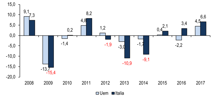 L’analisi dei dati dei conti nazionali pubblicati stamane dall’Istat evidenzia nel 2017 una crescita del PIL dell’1,5%, trainata dagli investimenti, componente della domanda che sale del 3,7%; nel dettaglio mentre rimane debole la crescita degli investimenti in costruzioni (+1,1%) presentano un forte dinamismo gli investimenti in Macchinari, mezzi di trasporto, prodotti della proprietà intellettuale che crescono del 6% e, grazie a questo ritmo di crescita, recuperano i livelli medi pre crisi (2000-2007).
