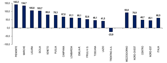Per quanto riguarda le sole auto elettriche se ne contano 19,6 ogni 100 mila circolanti, presenza ancora limitata rispetto agli altri maggiori Paesi europei: in media Francia, Regno Unito, Germania e Spagna contano 105,5 auto elettriche ogni 100 mila auto circolanti. In chiave territoriale la maggiore diffusione si osserva in Trentino-Alto Adige con 130,1 auto elettriche ogni 100 mila circolanti, seguito a distanza da Toscana con 28,9 auto ogni 100 mila circolanti, Lazio con 28,7 auto ogni 100 mila circolanti, Lombardia con 25,3 auto ogni 100 mila circolanti e Valle d’Aosta con 21,5 auto ogni 100 mila circolanti.