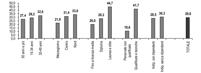 Imprenditori e lavoratori autonomi che svolgono una professione qualificata e tecnica mostrano una propensione a fare rete del 41,7%, quattro volte quella dei dipendenti che non sono qualificati (10,6%). Per quanto riguarda le figure professionali si registra una leggera maggior propensione alla rete per gli indipendenti senza dipendenti (30,3%) rispetto a quella degli indipendenti con dipendenti (28,5%).