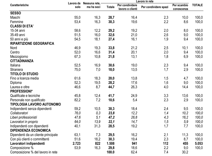 La tematica del lavoro in rete tocca in particolare i lavoratori indipendenti che tramite questo sistema di relazioni possono scambiarsi e condividere know-how, informazioni e risorse e cooperare. Un approfondimento sulla propensione dei lavoratori indipendenti a lavorare in rete è stato condotto relativamente al II trimestre del 2017 in Istat (2018a) e indica che la metà degli indipendenti – al netto dei coadiuvanti familiari – (53,9%) lavora da solo mentre il 29,8% lavora in rete ed il restante 16,3% non lavora in rete, ma ha dei soci. Nel dettaglio sono 1.508 mila gli indipendenti che lavorano in rete ed il 62,4%, pari a 941 mila persone, lo fa per condividere lavoro e clienti, il 30,2%, pari a 455 mila persone, per scambiarsi conoscenze ed il restante 7,4%, pari a 112 mila persone, per condividere spazi come si fa ad esempio nel cosiddetto coworking.