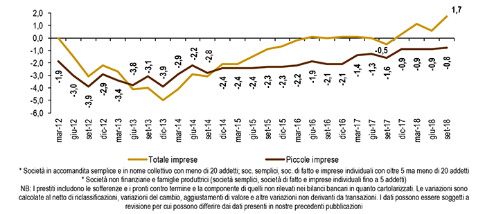 Gli ultimi dati sui prestiti alle piccole imprese relativi a settembre 2018 indicano un calo dello 0,8% a fronte di una crescita dell’1,7% dei prestiti al totale delle imprese (società non finanziarie e famiglie produttrici). A livello territoriale si registrano però aumenti dei prestiti alle piccole imprese in Campania (+1,8%), Basilicata (+1,6%), Lazio, Sardegna e Sicilia (tutte a +1,2%), Puglia (+1,0%) e Calabria (+0,6%) e stabilità nella Provincia Autonoma di Bolzano; solo in tre regioni la performance dei prestiti alle piccole imprese è migliore del totale dei prestiti al totale delle imprese: Sardegna, Sicilia e Calabria.
