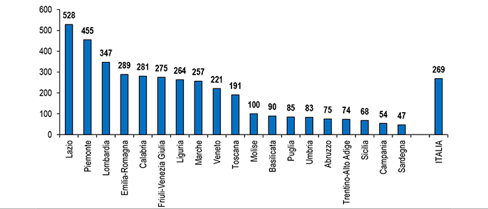 L’esame di un indice di intensità brevettuale – che abbiamo calcolato come rapporto tra numero di domande di brevetto e gli addetti nella manifattura – mostra una media nazionale di 269 brevetti ogni 100.000 addetti delle imprese manifatturiere. Tra le regioni che presentano valori superiori alla media, i valori più elevati si riscontrano nel Lazio, il cui indice di intensità è 528 brevetti ogni 100 mila addetti manifatturieri, in Piemonte (455) e in Lombardia (347); a seguire si posizionano l’Emilia–Romagna (289 ogni 100 mila addetti), la Calabria (281), il Friuli–Venezia Giulia (275). Al di sotto della media si posizionano la Liguria (264 ogni 100 mila addetti), le Marche (257), il Veneto (221), la Toscana (191) e il Molise (100), Basilicata (90), la Puglia (85), l’Umbria (83), l’Abruzzo (75), il Trentino–Alto Adige (74), la Sicilia (68), la Campania (54) e infine la Sardegna (47).