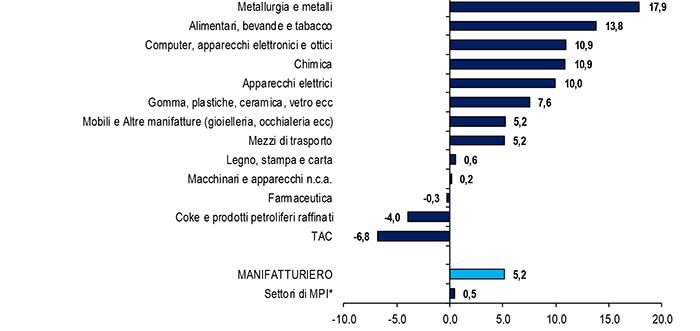 Nei primi nove mesi del 2021 la produzione manifatturiera è dell’1,1% inferiore rispetto allo stesso periodo del 2019, anno precedente allo scoppio della pandemia, un calo meno pronunciato rispetto a quelli di Francia (-5,8%) e Germania (-6,7%), anche grazie all’apporto delle micro e piccole imprese che nella manifattura italiana addensano più della metà degli addetti.