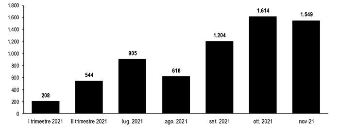 Secondo il report sul super ecobonus del 110% dell’Enea e del Ministero della transizione ecologica, al 30 novembre 2021 sono salite 69.390 asseverazioni/edifici in Italia con 11.936 milioni di euro di investimenti per lavori ammessi a detrazione, con 8.277 milioni di euro per lavori conclusi ammessi a detrazione.