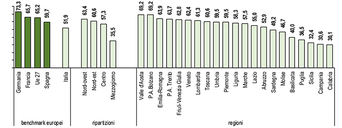 Tasso di occupazione femminile per regione e maggiori paesi Ue