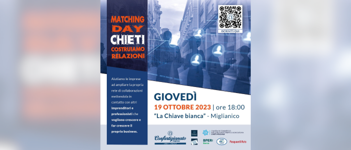 A Chieti arriva il primo MatchingDay, l’evento finalizzato a creare nuove occasioni di business per le imprese ed i professionisti dando loro l’occasione di far crescere la propria rete di contatti e di collaborazioni. Pensato secondo lo schema del business speed-dating, brevi incontri one-to-one della durata di 15 minuti, l’evento è promosso da Confartigianato Imprese Chieti L’Aquila, dal Movimento Donne Impresa e da quello Giovani Imprenditori dell’associazione.