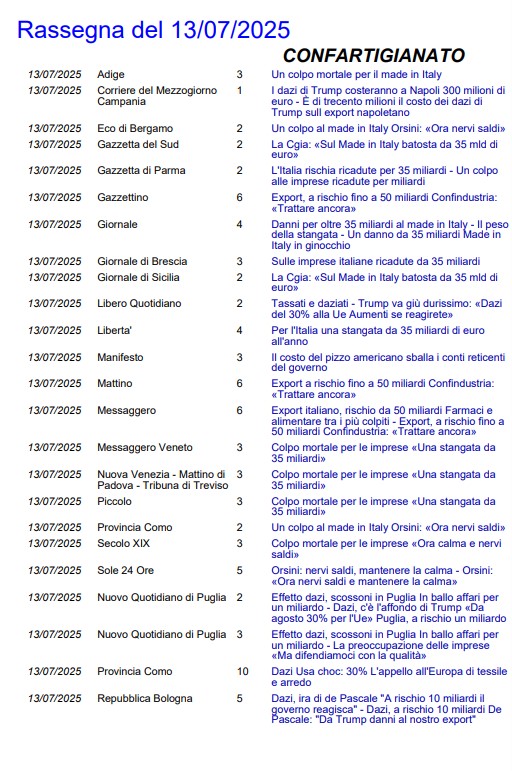 Dazi Usa al 30% sui prodotti Ue: l’allarme di Confartigianato su Tg1, Rai3, La7 e Radio24
