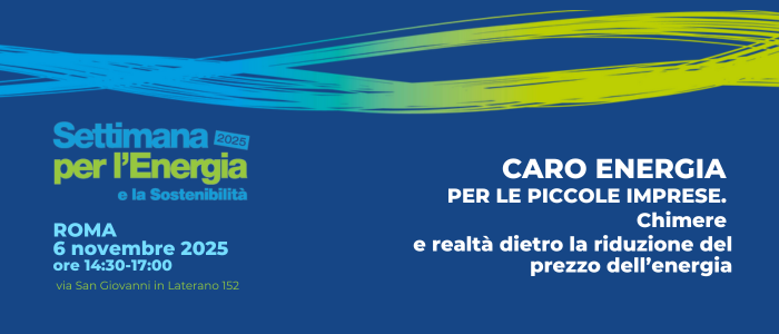 Giovedì 6 novembre, dalle 14:30 alle 17, la sede nazionale di Confartigianato ospita il seminario “Caro energia per le piccole imprese. Chimere e realtà dietro la riduzione del prezzo dell’energia”, organizzato nell’ambito della Settimana per l’Energia e la Sostenibilità di Confartigianato Impese Sostenibili.
