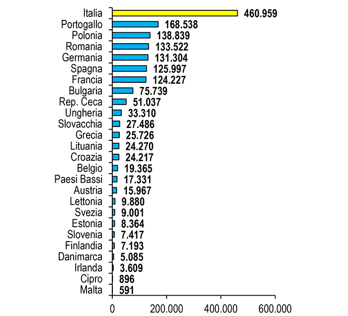 Anno 2023. Valori assoluti. Ateco 2007: 13, 14 e 15. * Escluso Lussemburgo n.d. e per Spagna nostre stime – Elaborazione Ufficio Studi Confartigianato su dati Eurostat