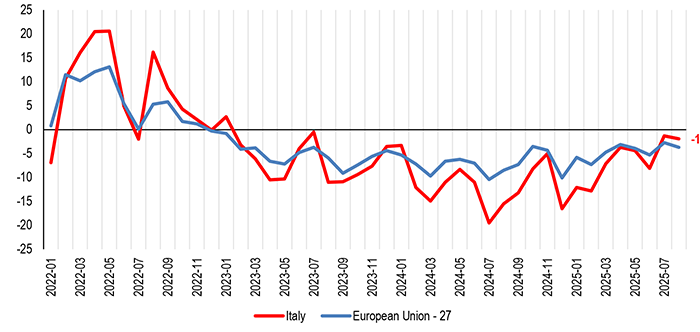Gennaio 2022-agosto 2025 – var. % tendenziale, dati corretti per calendario, C13-14-15 – Elaborazione Ufficio Studi Confartigianato su dati Eurostat