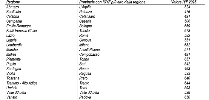 Prime province per ogni regione con valori più alti dell’ICYF 2025
