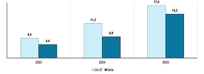 Raddoppiano anche le piccole imprese che usano l’IA, salendo al 14,2% a fronte del 6,9% del 2024 e al 4,4% del 2023. Tenuto conto del trend delle imprese attive, si stima che le piccole imprese che usano l’IA nel 2025 salgono del 110,8%. Nel confronto europeo l’uso dell’IA interessa il 17,0% delle piccole imprese nell’Unione europea a 27, con quote più elevate per Germania (23,1%) e Spagna (17,2%), mentre la diffusione in Francia (15,0%) è più allineata a quella dell’Italia (come anticipato pari al 14,2%).