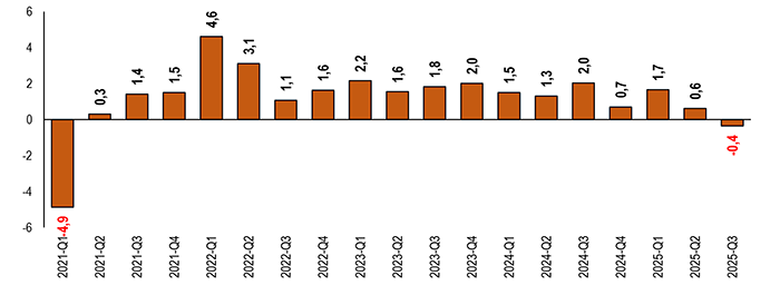 L’analisi dei dati trimestrali evidenzia che nel terzo trimestre del 2025 l’occupazione torna in territorio negativo (-0,4%) dopo 17 trimestri consecutivi di crescita.