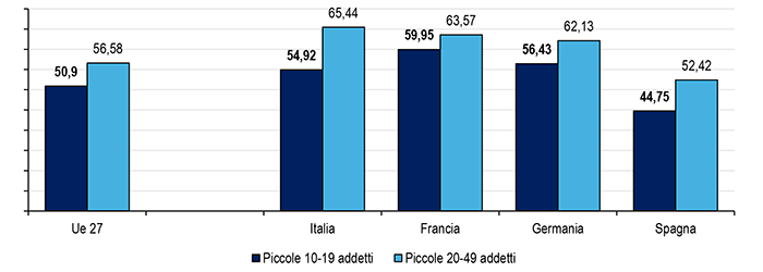 Secondo i dati Eurostat nel 2023 (ultimo anno disponibile) la produttività delle piccole imprese tra 10 e 19 addetti è superiore del 7,9% alla media Ue e quella delle piccole imprese tra 20 e 49 addetti risulta superiore del 15,7% alla media Ue e superiore anche a quella delle omologhe della Germania.