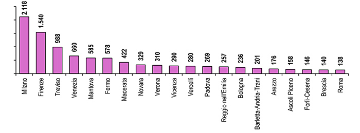 In chiave provinciale la maggiore specializzazione – indicatore che descrive in modo plastico la natura distrettuale del settore – si riscontra a Fermo con le calzature che concentrano il 24,28% dell’occupazione delle imprese del territorio. Seguono Macerata con 5,56%, Barletta-Andria-Trani con 2,97%, Pisa con 2,86%, Lecce con 2,51%, Arezzo con 2,16%, Pistoia con 2,11%, Forlì-Cesena con 2,06%, Ascoli Piceno con 1,54% e Treviso con 1,51%.