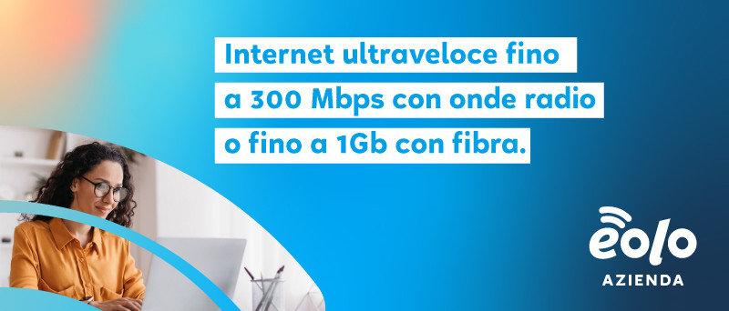 - EOLO Impresa Advance: la soluzione più performante per le imprese di medie e grandi dimensioni, con connettività Internet fino a 300/50Mbps (FWA) e a 1 Gbps/500 Mbps (Fibra), include router con Wi-fi 7 integrato, installazione Premium in 5 giorni lavorativi e 1 indirizzo IP statico.